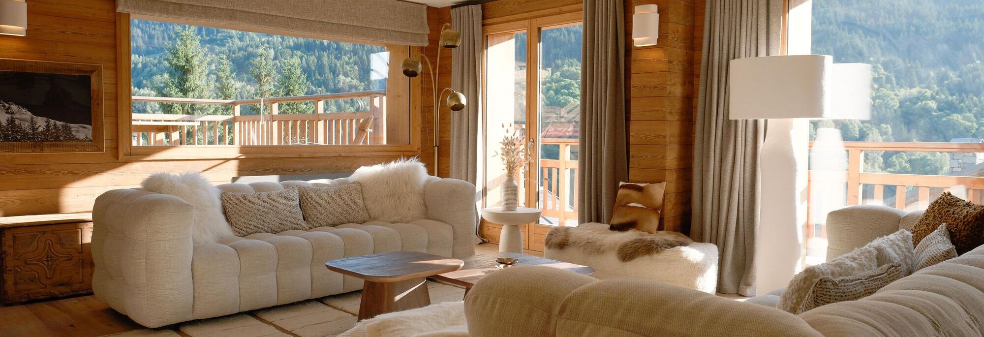 Une escapade alpine raffinée et sophistiquée, avec une vue panoramique, un design impeccable et un espace bien-être dans le chalet.