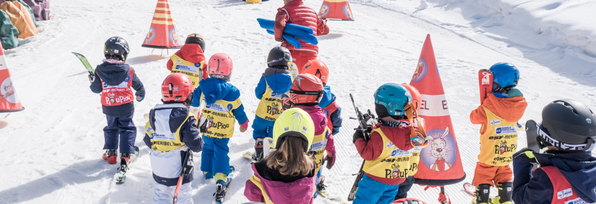 Le Club Piou-Piou et nos moniteurs ESF accueillent les enfants pour un apprentissage du ski dans un espace sécurisé et ludique où les animations et les activités sont adaptées à leur âge, avec les personnages Piou-Piou, Blanchot, Garolou, etc.