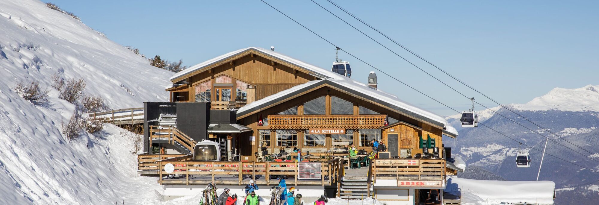 Restaurant d'altitude à Mottaret Meribel. Sert : Petit Déjeuner, déjeuner et peut accueillir des groupes. L'établissement est divisé en deux parties: un snack au niveau des pistes et un restaurant sur les deux étages supérieurs.