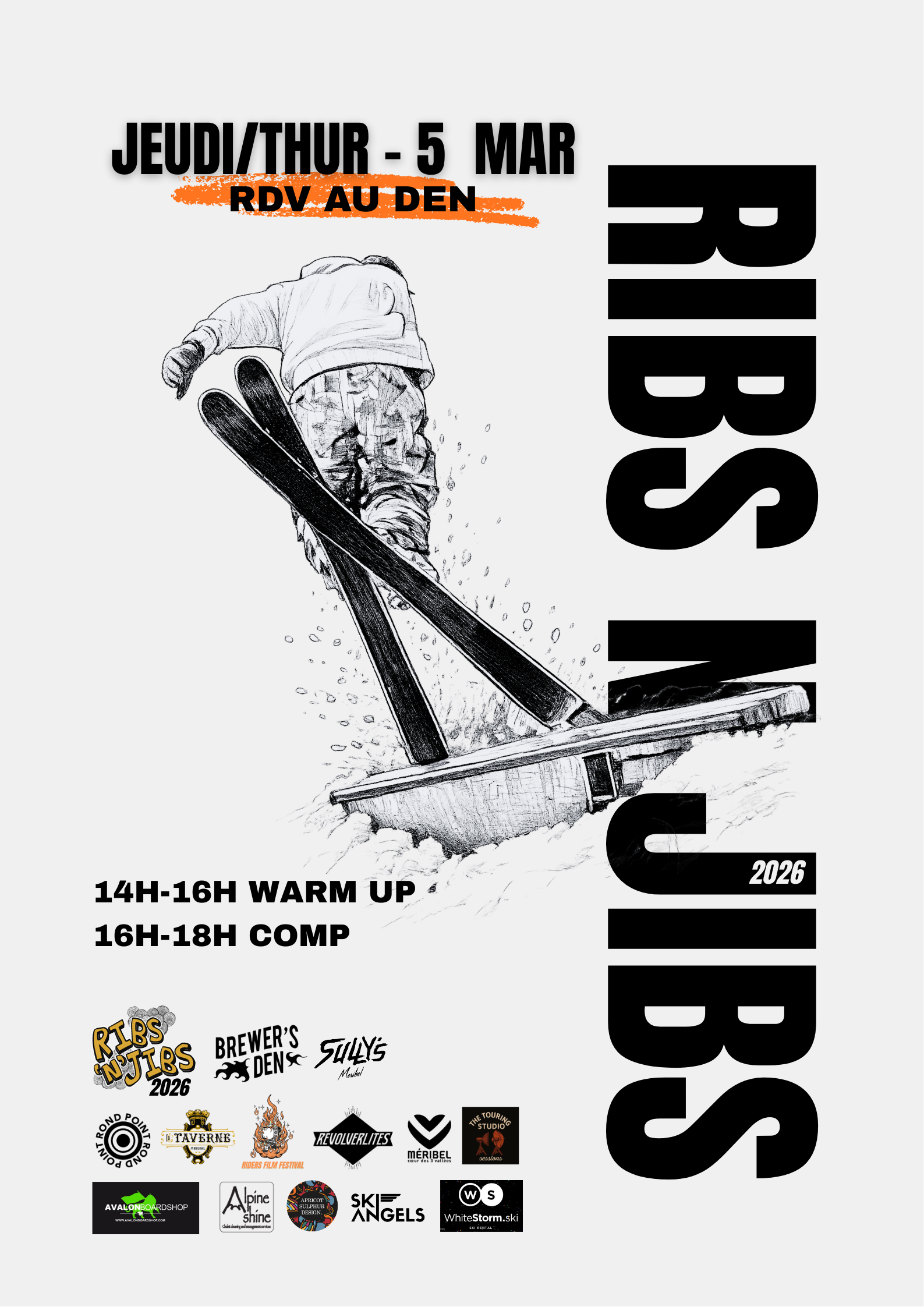 Ribs & Jibs Méribel revient le 5 mars 2026 ! Ski rail jam, compétition de jib amateur, BBQ, DJs et grosse fête après-ski au cœur de Méribel. Warm up 14h-16h. Comp 16h-18h. Bbq & DJ set 14h-18h. After Party & Prix à Sullys Club 18h-22h.