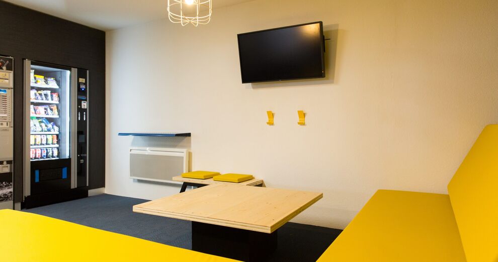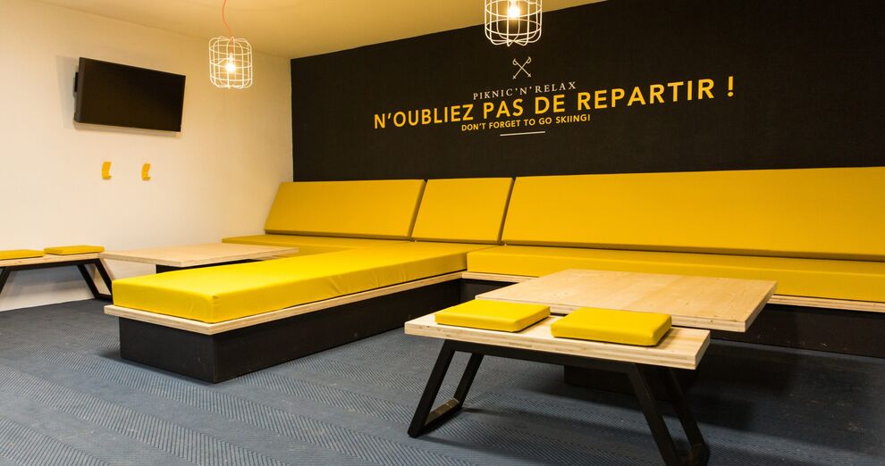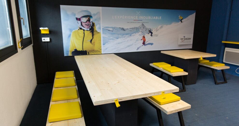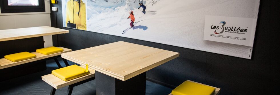 Under the Pas du Lac gondola : a rest room for a break or relaxing time in the heart of Méribel Mottaret ! Fully equipped with a kitchen, sofas, Wi-Fi and recharging spots for smartphones and other devices,