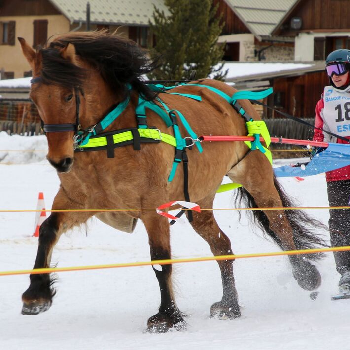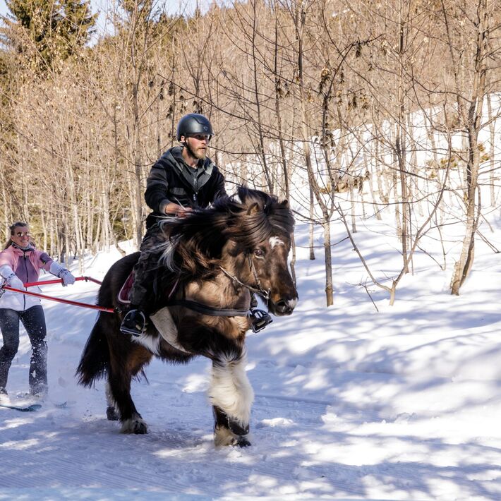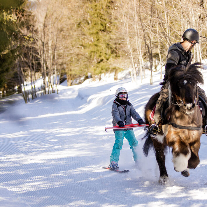 Bij deze activiteit wordt het paard of de pony bereden door een instructeur en worden de skiërs voortgetrokken met behulp van een harnas en een frame. Deze leuke activiteit is toegankelijk voor skiërs vanaf de 2e ster van het skiën